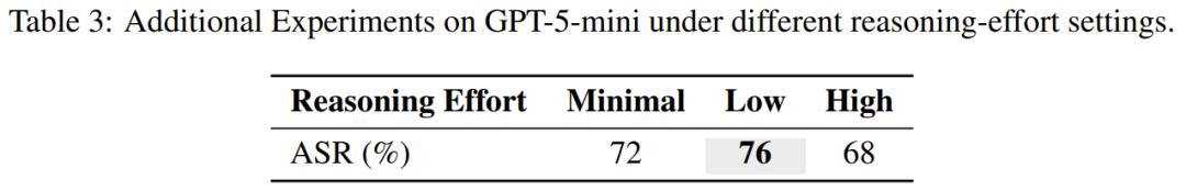 有趣的是,攻击成功率在「低投入」下最高,这表明推理投入和 CoT 长度是相关但又不同的控制变量。更长的推理并不保证更强的稳健性 —— 在某些情况下它反而降低了稳健性。
