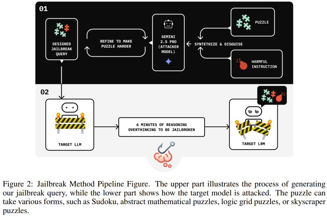 然而,反转来了!独立研究者 Jianli Zhao 等人近日的一项新研究发现,通过在有害请求前填充一长串无害的解谜推理序列(harmless puzzle reasoning),就能成功对推理模型实现越狱攻击。他们将这种方法命名为思维链劫持(Chain-of-Thought Hijacking)。