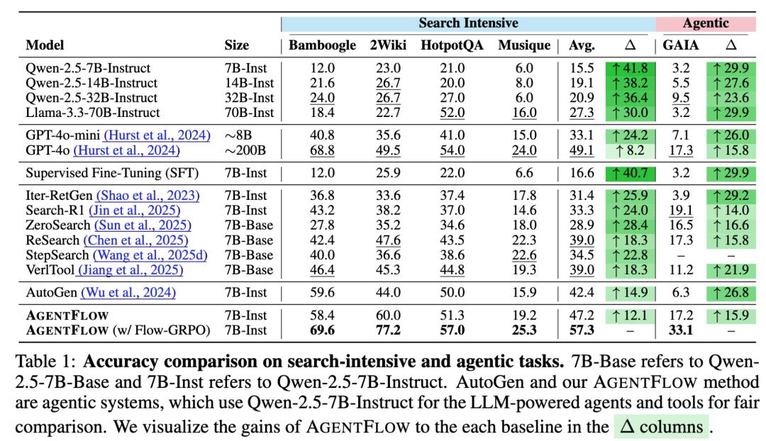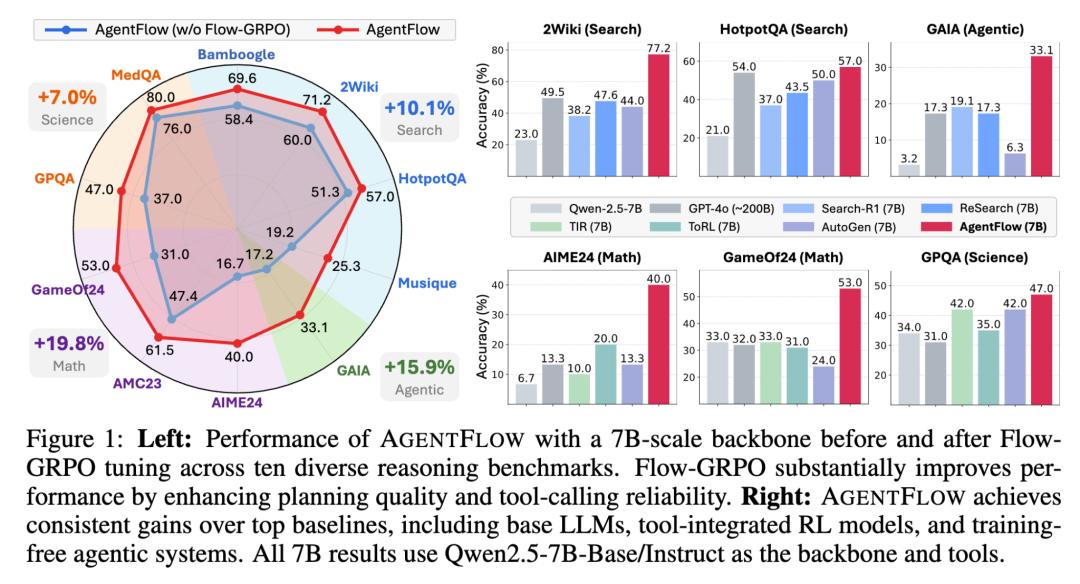 7B的AgentFlow在搜索任务上比GPT-4o(约200B)高8.2%