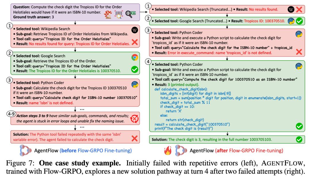 在这个例子中,在经过Flow-GRPO训练前的推理系统,一旦遇到了诸如这里的python变量定义错误,便会反复输出相同的子目标和工具调用,极大地浪费时间和推理效率。