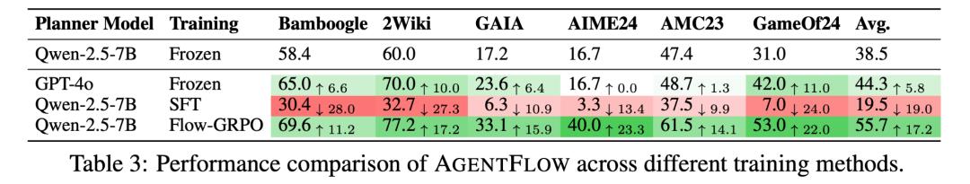 以Qwen-2.5-7B-Instruct为基座模型,AgentFlow 在所有类别中均显著领先。