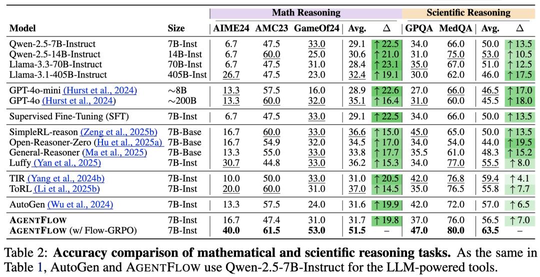 实验结果显示,仅7B参数的AgentFlow在搜索、数学、科学等多个任务上全面超越GPT-4o(约200B参数)和 Llama-3.1-405B。