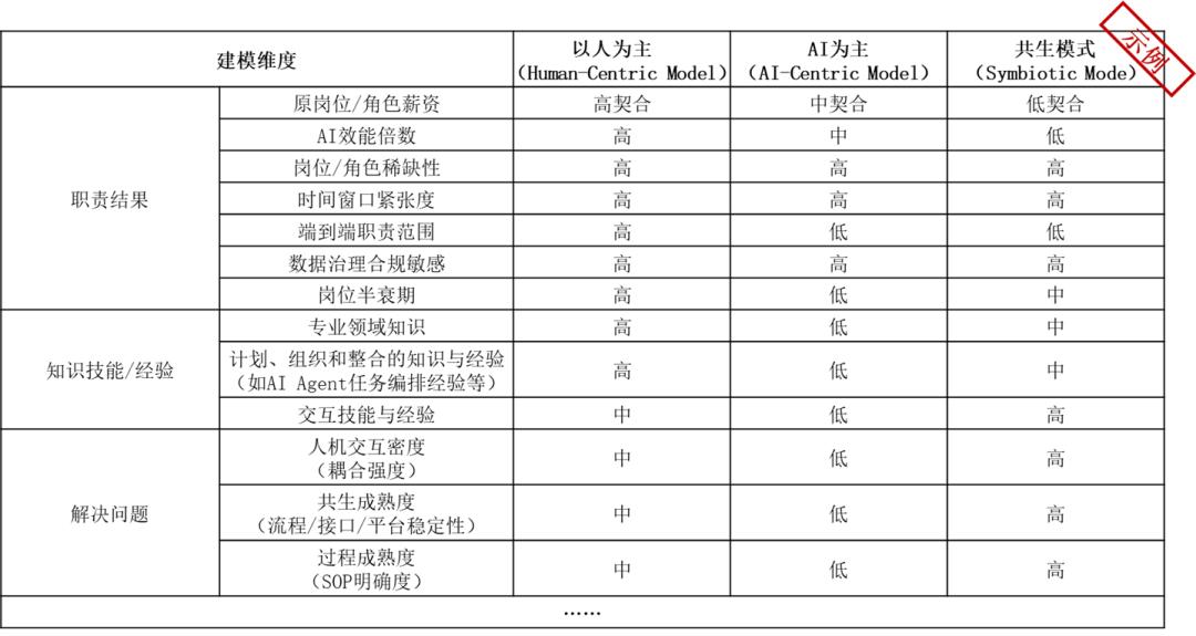 有些定价维度可以跨HAIC的不同模式共用,比如市场稀缺度、时间窗口紧张度。有些定价维度则会根据不同的HAIC模式而有所差异化。比如在以人为主(Human-Centric Model)模式下定价时可以考虑原岗位薪资、AI效能倍数(使用AI带来的效能提升),但共生模式(Symbiotic Mode)则无法使用,因为共生模式一般会伴随完整的流程改造,嵌入其中的人类员工岗位/角色与原有岗位差异较大;再比如岗位半衰期(岗位生命周期)对于以人为主(Human-Centric Model)模式和共生模式(Symbiotic Mode)相对重要,而对于AI为主(AI-Centric Model)中的人类员工定价可能就不是关键因素。不同的组织在不同的时间窗口,会有不同的定价维度选择,也会构建出不同的模型关系。下文展示部分建模可能相关的维度,供参考。