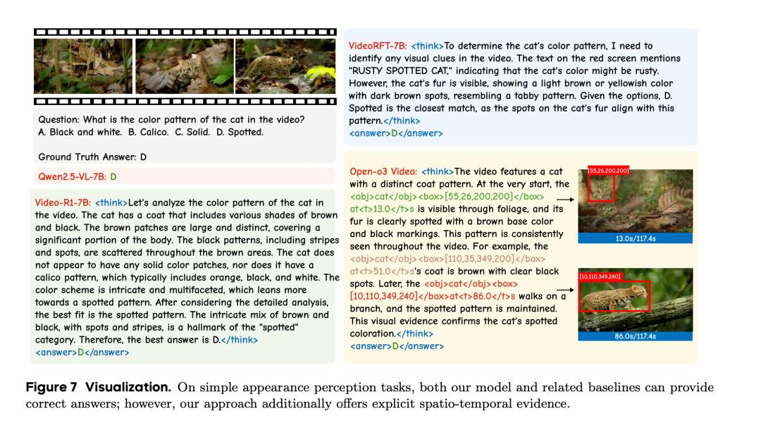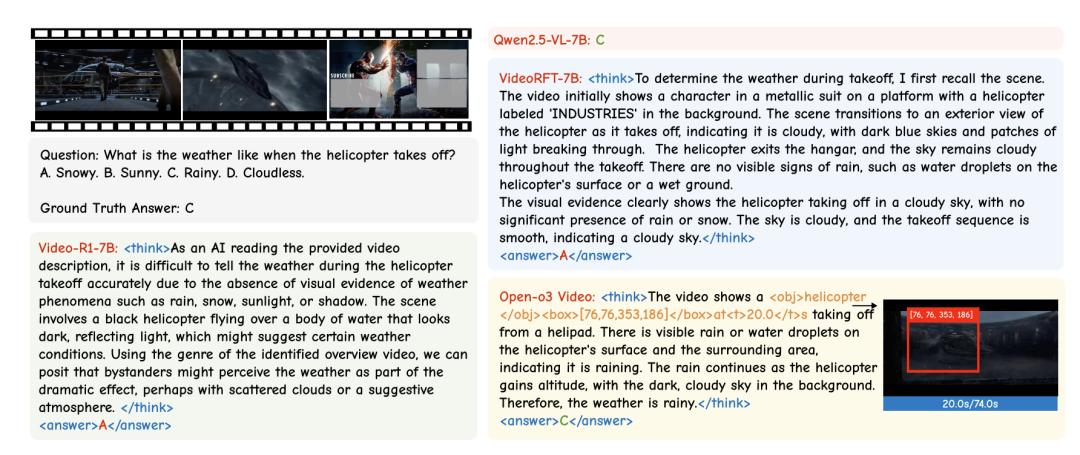 这些示例分别体现了Open-o3 Video在处理物体外观识别,动作意图分析,以及天气推理上的突出性能。