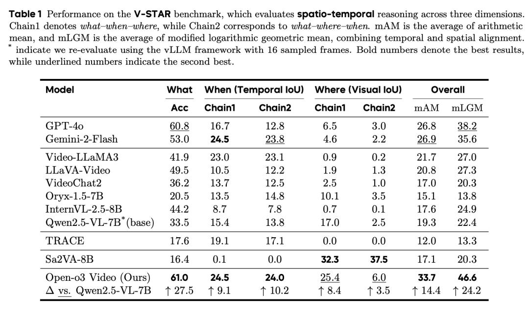首先,团队在时空推理的基准 V-STAR上测试,该基准综合考察了模型在 “何物(what)—何时(When)—何地(Where)” 三个维度上的性能。