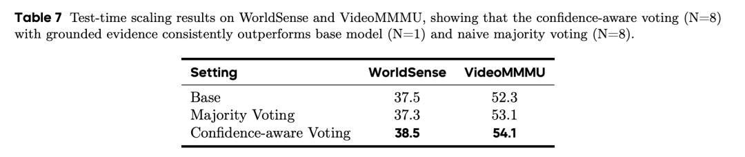 表7的结果可以看到,在WorldSense与VideoMMMU两个测试基准上,基于置信度的测试时扩展策略带来稳定提升,均优于单一推理(Base)与简单多数投票(Majority Voting)方案。