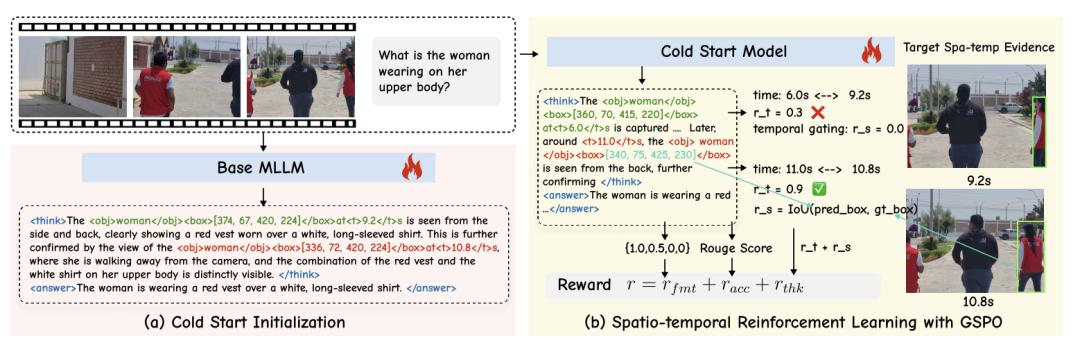 因此,要让模型能够主动发现并引用关键证据,必须通过一种可自我纠偏的强化学习机制,让奖励信号直接约束其“看哪帧、注意哪个区域、想什么”。
