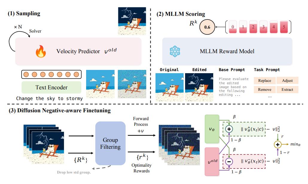 如下图所示,UniWorld-R1的pipeline主要包括三个部分:采样、MLLM评分和DiffusionNFT,这三个部分逐步将模型与最优策略对齐。