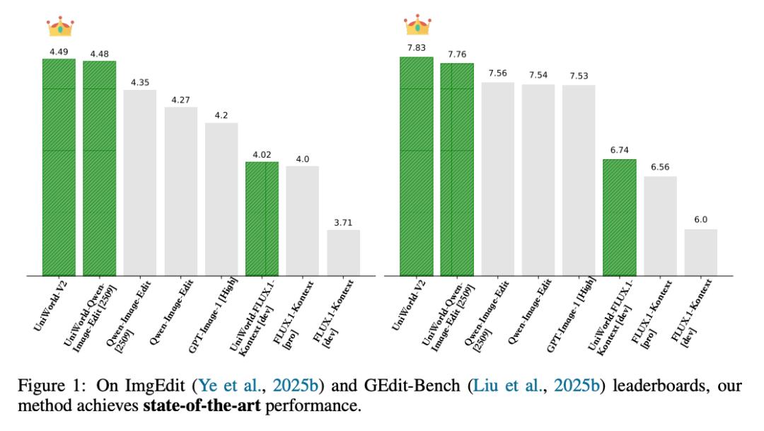 研究团队训练FLUX.1-Kontext [Dev]、Qwen-Image-Edit [2509]和UniWorld-V2作为基础模型,并采用ImgEdit和GEdit-Bench作为测试基准。前者将多种专门任务统一为一个通用框架以进行全面模型比较,后者通过丰富的自然语言指令评估通用图像编辑。