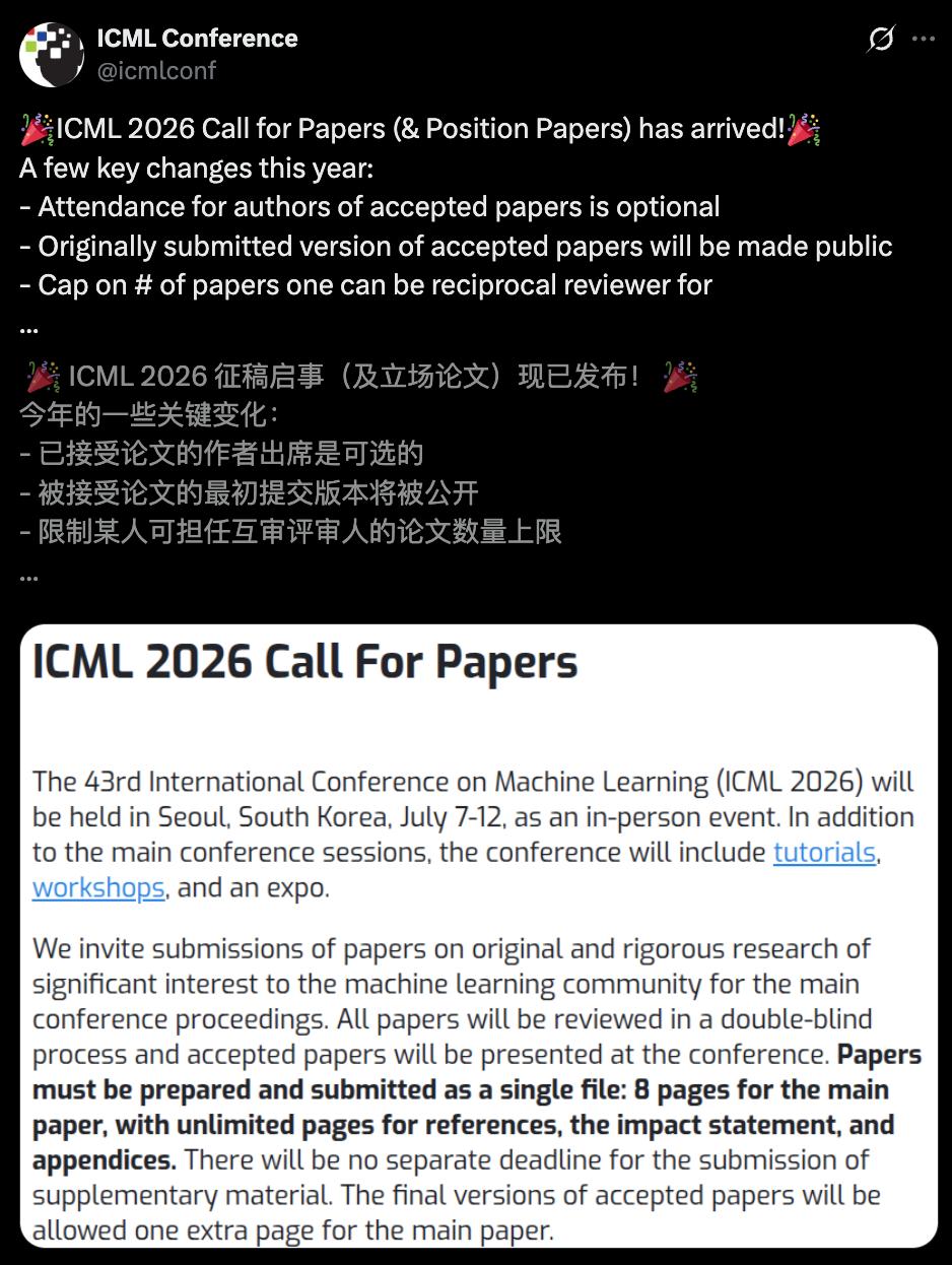 ICML 2026论文征稿,正式开启!