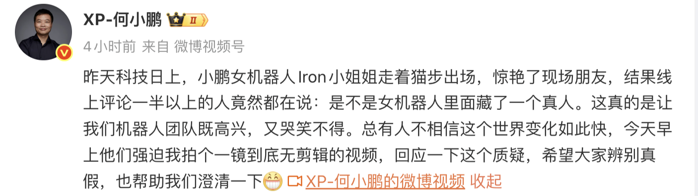 凤凰网科技讯 11月6日,小鹏汽车董事长何小鹏发视频,回应了网友对小鹏Iron机器人小姐姐走猫步,里面是真人的质疑。他表示,这种质疑让团队既高兴,又哭笑不得。为了打消这个质疑,团队强迫自己拍了个一镜到底无剪辑的视频。