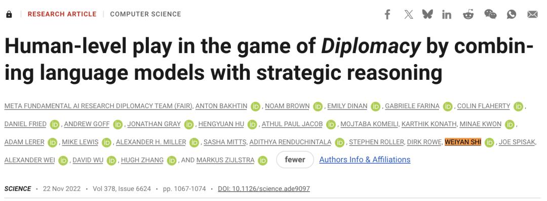 该项目打造了首个在博弈游戏《外交》(Diplomacy)中达到人类水平的AI谈判智能体。