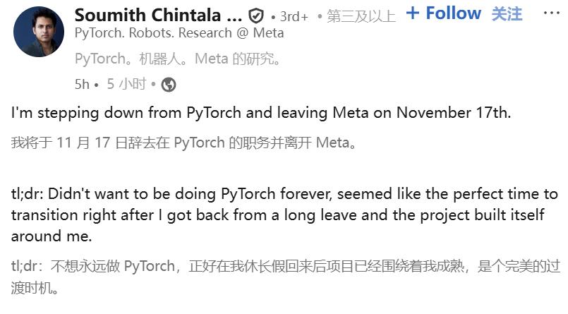 刚刚,PyTorch创始人Soumith Chintala官宣,将于11月17日离职Meta!