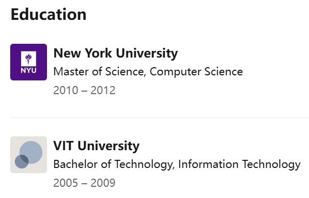 他毕业于纽约大学(NYU)和韦洛尔理工学院(VIT Vellore)。