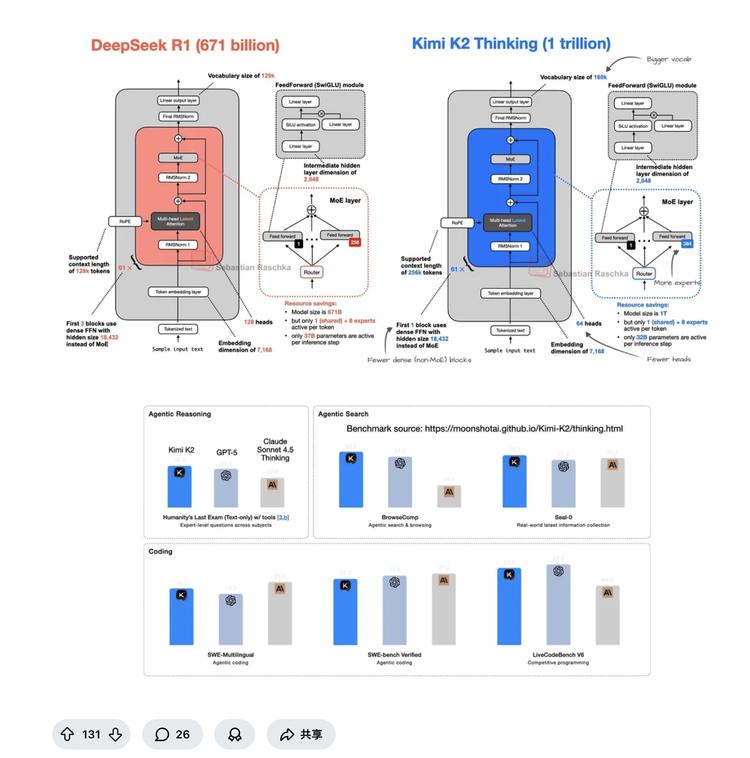 Kimi K2 Thinking目前还没有发布技术报告,仅有技术博客、使用文档,未披露它的训练数据、RL细节或配方。模型发布后不久,技术社区的关于模型架构本身的讨论也开始出现。在X和Reddit上,一张将其与DeepSeek模型并排比较的架构图又开始流传,引发了关于其技术渊源的讨论。