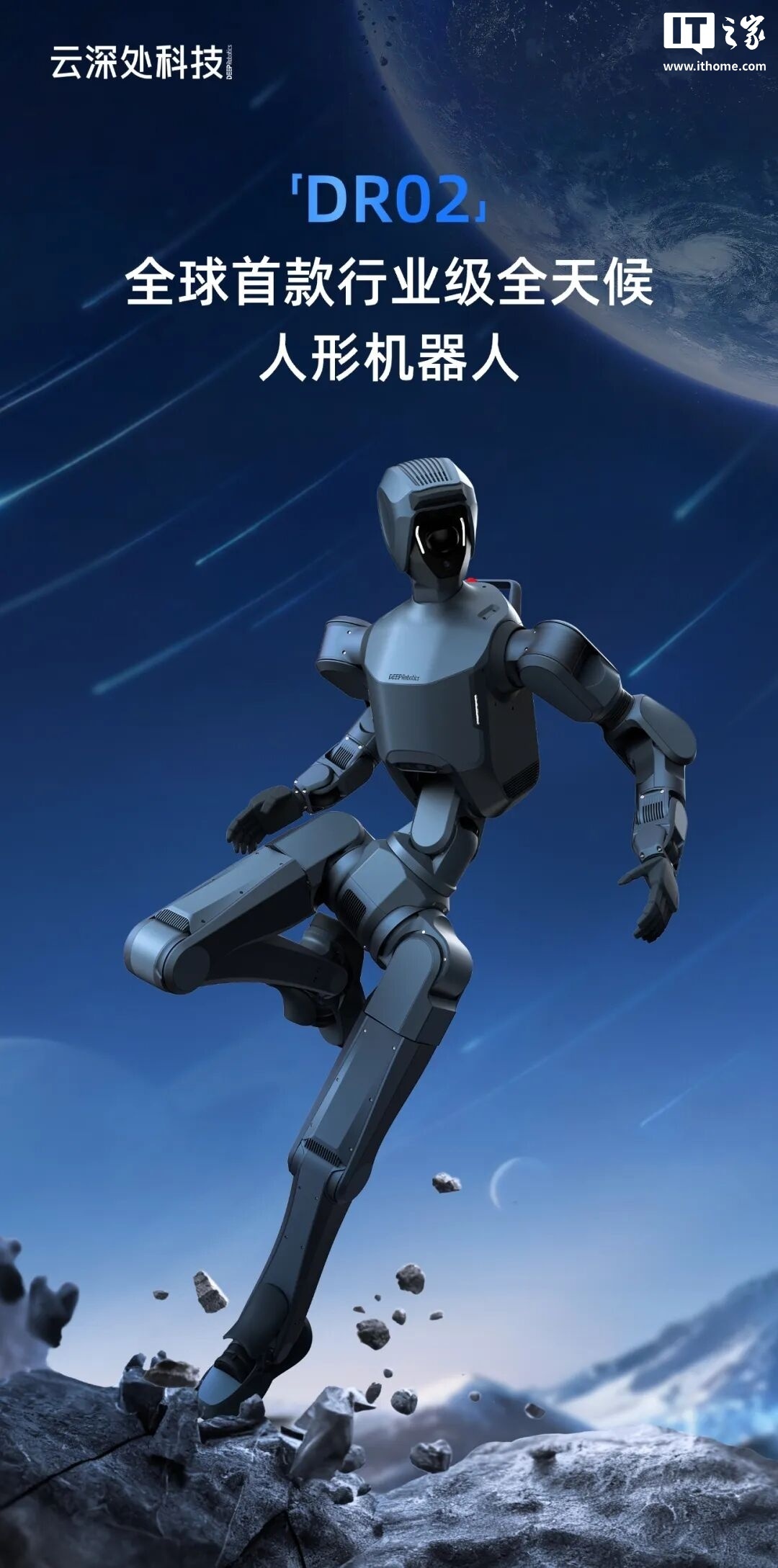 云深处科技 10 月 9 日发布全球首款行业级全天候人形机器人“DR02”,支持整机 IP66 防水防尘,可满足全天候户外作业场景需求;支持 1.5m/s 行走速度和 4m/s 极限速度,可行走在 25cm 高度楼梯和 20° 角度斜坡上。