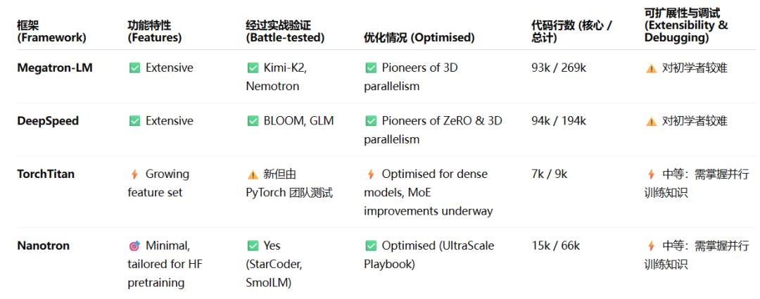 文章总结了一些主要的框架在后训练各环节中的支持范围,涵盖从监督微调到偏好优化,再到强化学习等核心领域的能力对比。