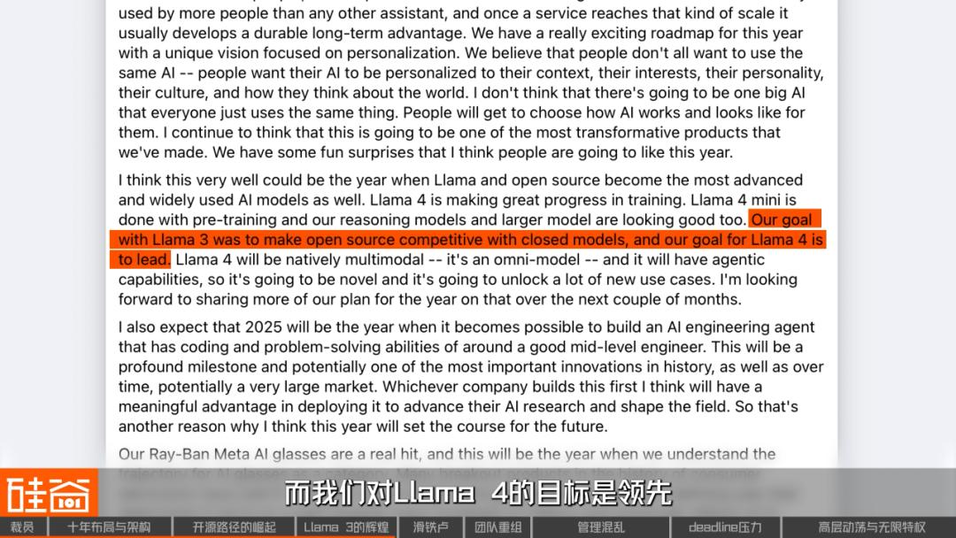 扎克伯格在2025年1月底财报会议后发帖说,“我们对Llama 3的目标是使开源与封闭模型具有竞争力,而我们对Llama 4的目标是领先。”
