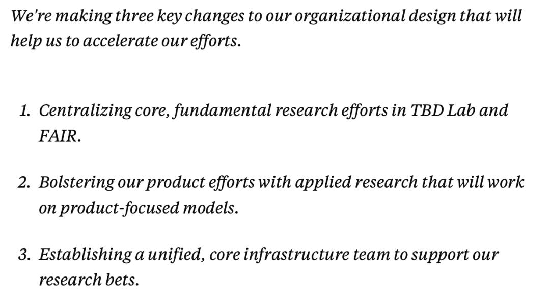 第一条就是把基础研究、TBD Lab和FAIR更集中化,就让它两个更紧密的去结合。所以这回裁掉的一些研究人员,邮件上也说,可能他们的项目没有那么高的影响力。你再做一些前沿的研究,但和我们现在没有关系,因为很多前沿研究是高度抽象的,是从数学的角度,从很多理论的角度,它其实和工程的离得比较远。