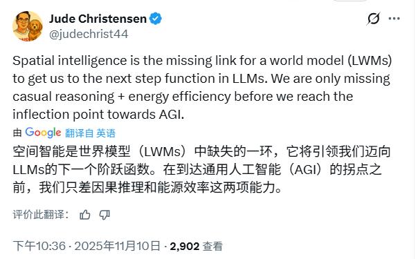空间智能是世界模型中缺失的一环,它将推动LLM的能力实现一次巨大飞跃,只要因果推理能力和能效达到相应水平,我们就将站在通往AGI的拐点上。