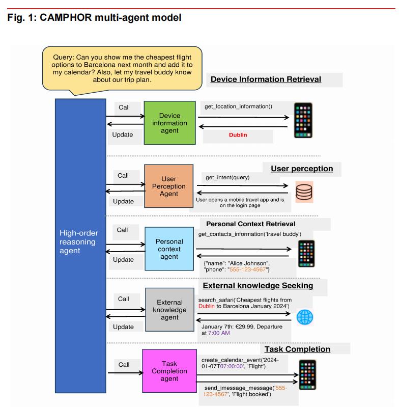 该系统由一个云端“高阶推理智能体”和五个在设备上运行的专业智能体组成,它们协同工作,以完成传统LLM无法胜任的任务。