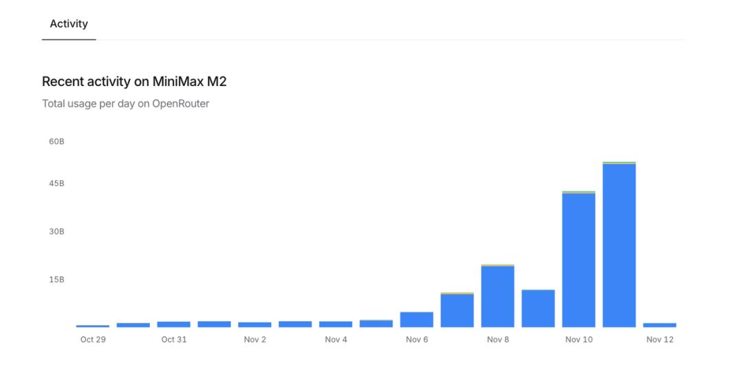 10月底发布的M2,在OpenRouter这个全球最大的模型聚合平台上的成绩,则证明了其在文本模态上的实力。