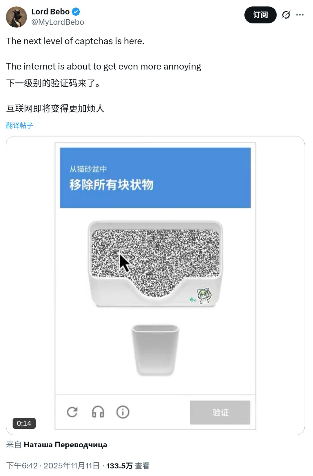 这是最近很火的一篇调侃「我不是机器人」验证流程的帖子。视频里显示,用户得用鼠标一个个点选那些灰色的「猫屎团」,拖到旁边的垃圾桶里,最后过关后,得勾选「我不是猫」。