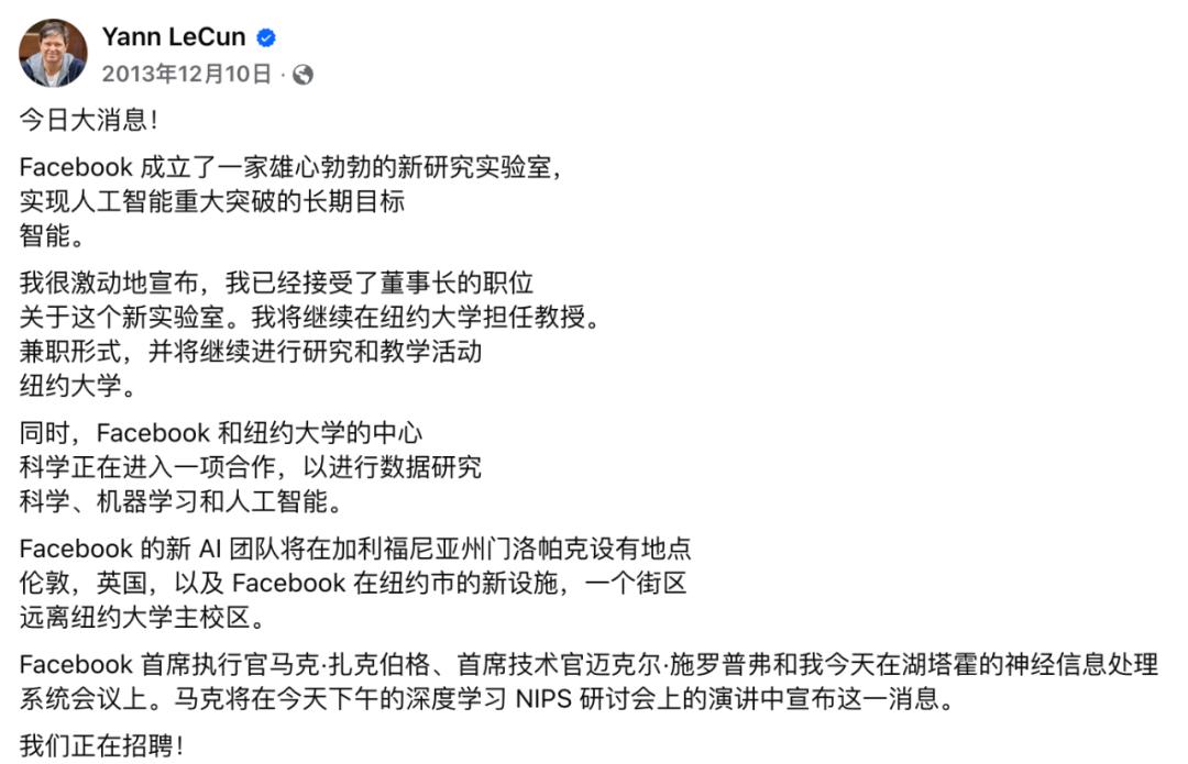 2013 年末,LeCun 正式加入 Facebook,出任新成立的 Facebook AI Research(FAIR) 实验室负责人。