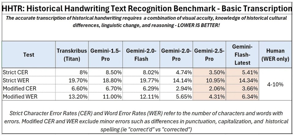 从GPT-4到Gemini-2.5-Pro,AI在HTR领域的准确率持续提升。2024年底,Gemini-2.5-Pro已能在复杂手稿上实现4%的字符错误率(CER)与11%的词错误率(WER),已进入专业人工水准。而汉弗莱斯此次测试的新模型,则进一步将CER降至0.56%,WER降至1.22%——这意味着每200个字符仅错1个字母或标点。