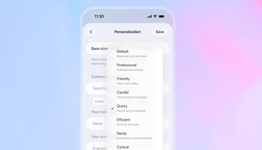 (注:有八种预先的人设选项,除默认设置外,还包含专业、友好、直言、古怪、高效、讽刺及书呆子等多种风格。)