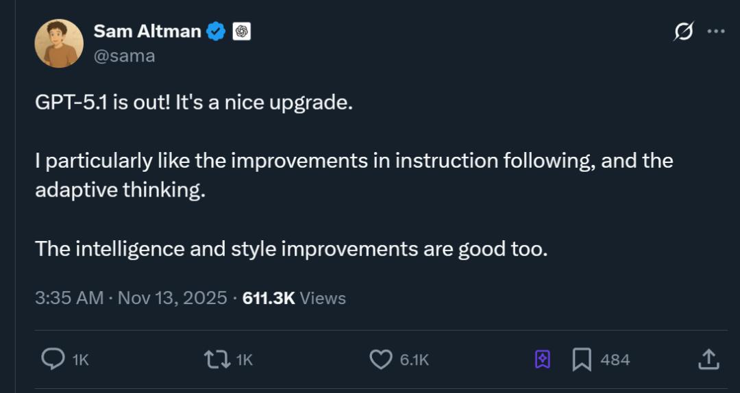 OpenAI表示,本周晚些时候,他们会将GPT-5.1 Instant和GPT-5.1 Thinking都引入API。