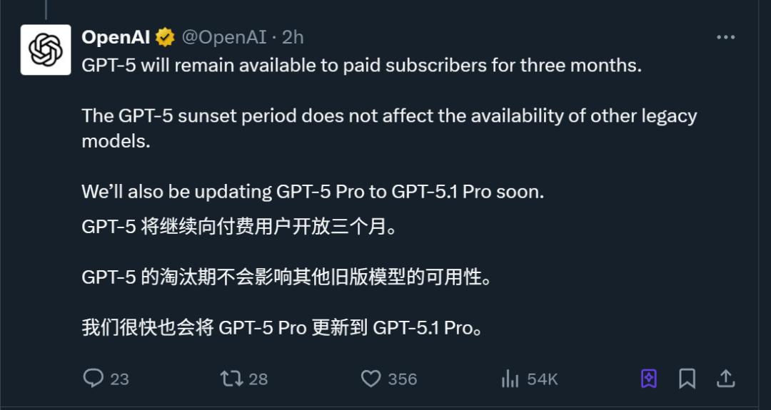 旧版本GPT-5将继续向付费用户开放三个月,等过渡期结束才会下架。
