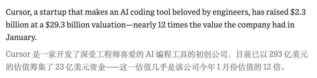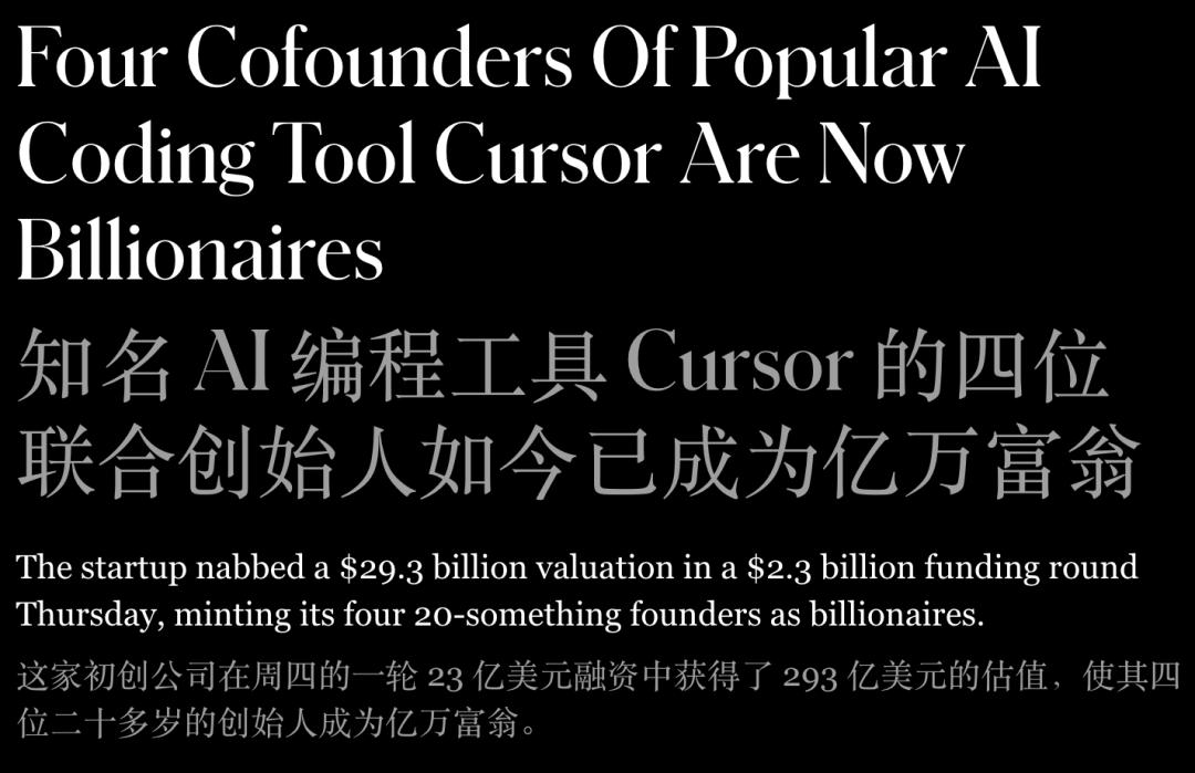 今天,全球爆火编程AI初创Cursor完成了23亿美金融资,估值直冲300亿美金。