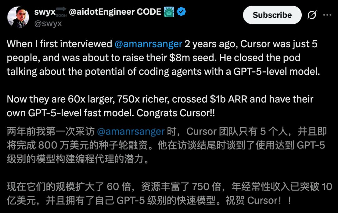 如今,Cursor成为了全球少数几家估值超100亿美金的AI初创公司之一。