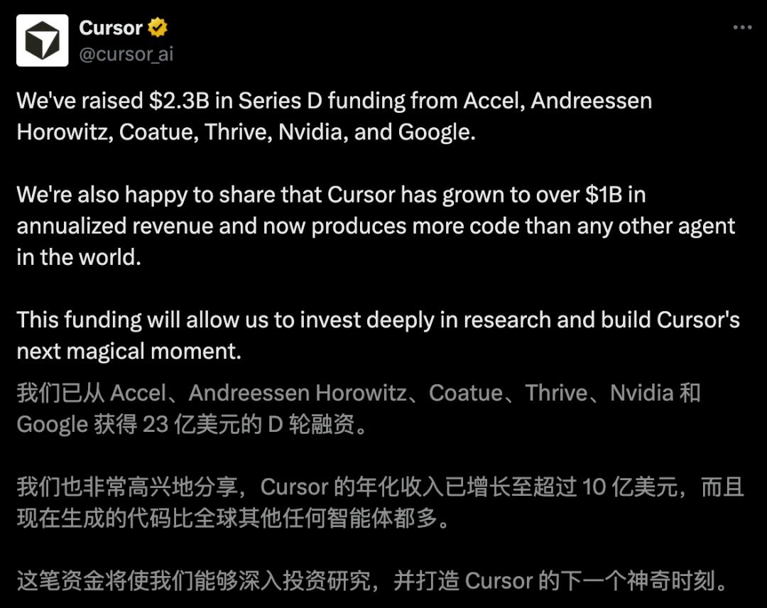 如今,这笔新一轮融资,将用来打造Cursor的下一个神话。