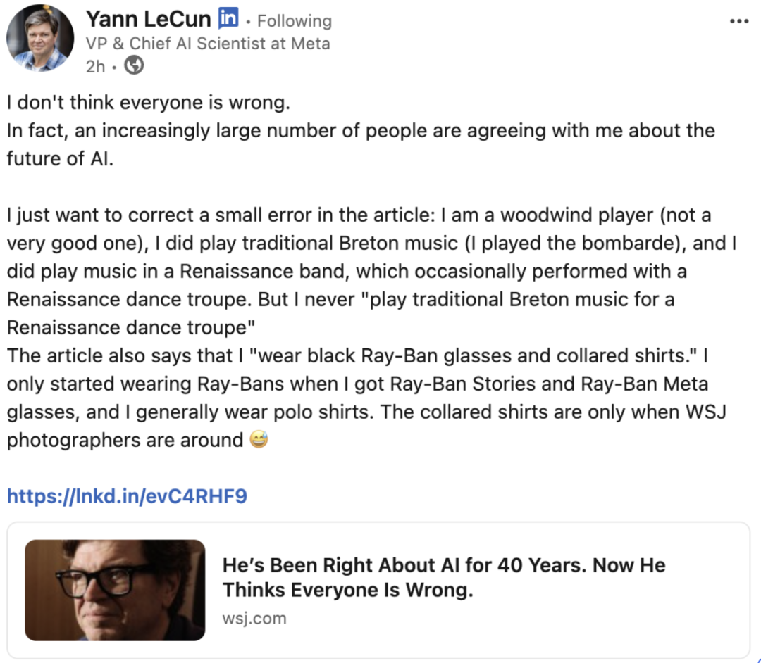 面对媒体的报道,Yann LeCun只是指出了报道中的「小错误」,并没有否认即将离职的消息。