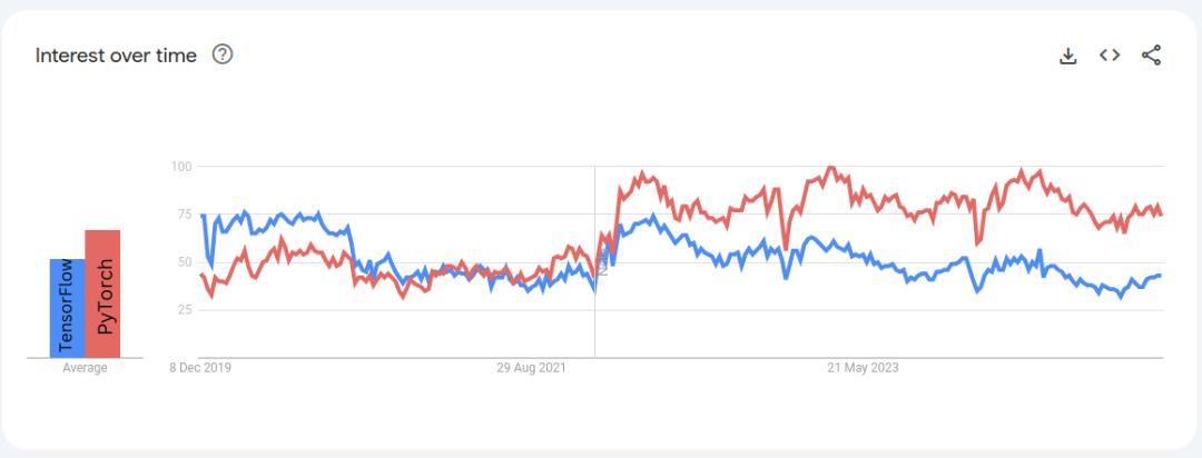 到2021年,TensorFlow在谷歌上的搜索量都高于PyTorch。然而,现在PyTorch已经反超,搜索量几乎是TensorFlow的1.8倍。