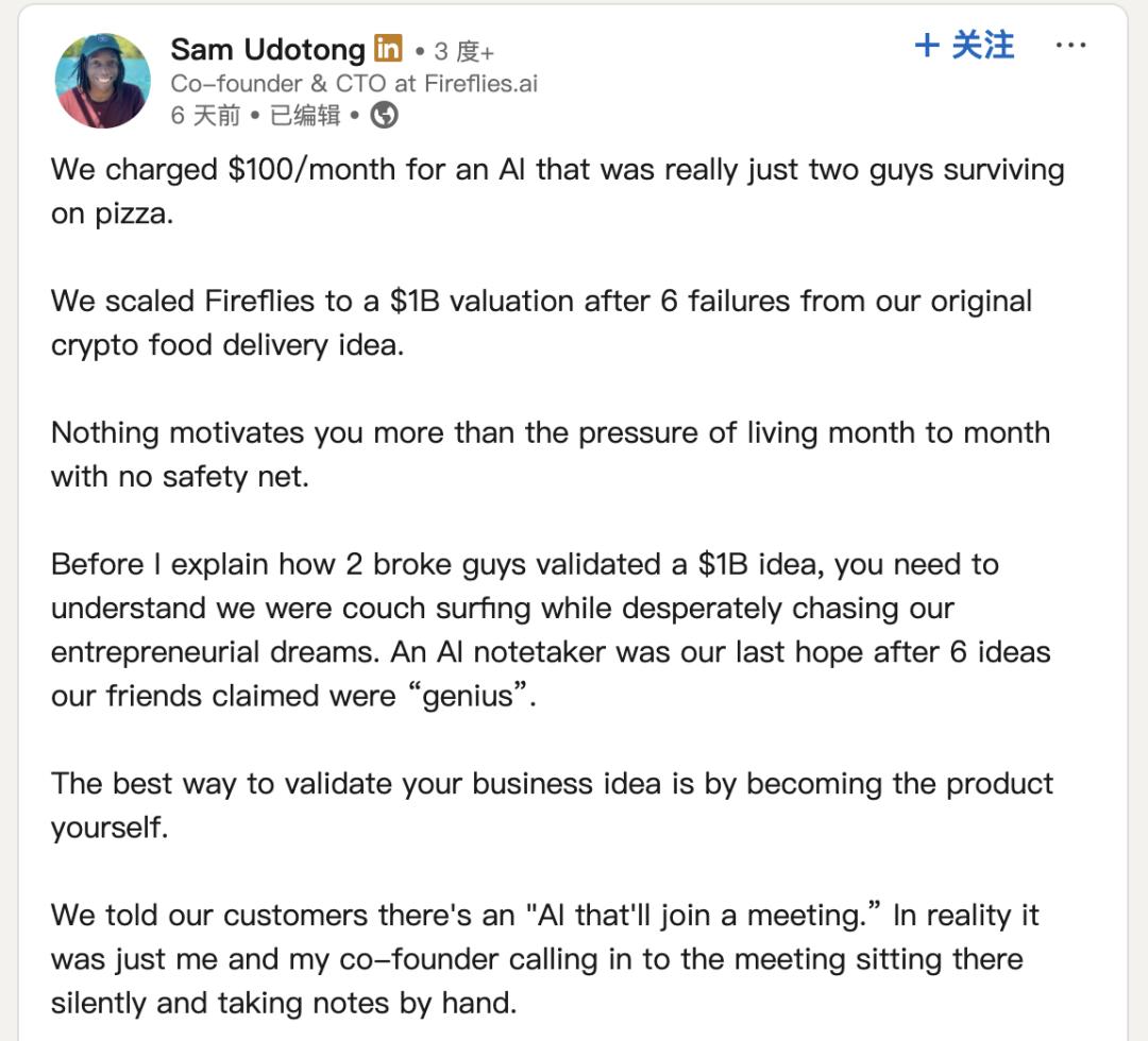 联合创始人兼 CTOSam Udotong也喜欢在 LinkedIn 上畅所欲言,他在一篇帖子里毫不避讳地揭开了企业成立早期的秘密:2017 年,他们向客户收取每月 100 美元的费用,宣称提供一个能够“自动加入会议、自动记录笔记”的 AI 助理。