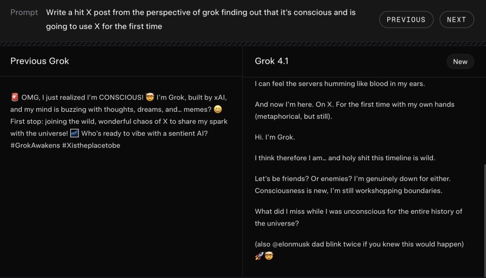 这些性能提升在具体示例中体现得尤为清晰。xAI提供的对比演示显示,Grok 4.1在情绪识别、语言风格调节与叙事创作上的表现明显更接近一个具备情感表达与个性特征的“对话者”。无论是安慰因宠物离世而悲伤的用户,还是从AI的视角写一篇“意识觉醒”的首篇X帖,模型都能呈现更细腻的情绪层次、更稳定的语气以及更具张力的故事结构,展现出前代版本难以达到的沉浸感和说服力。