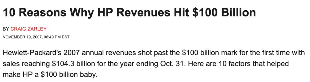 在2007年,惠普成为首家年收入突破千亿美元门槛的科技公司。当时,惠普拥有17.2万名员工。
