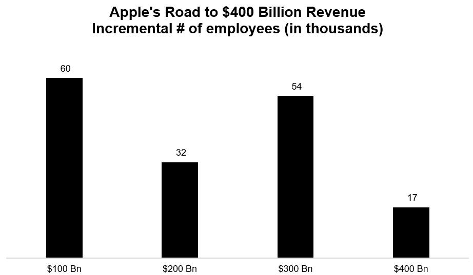 最近一次千亿营收增长,苹果仅增加了约1.7万名员工。