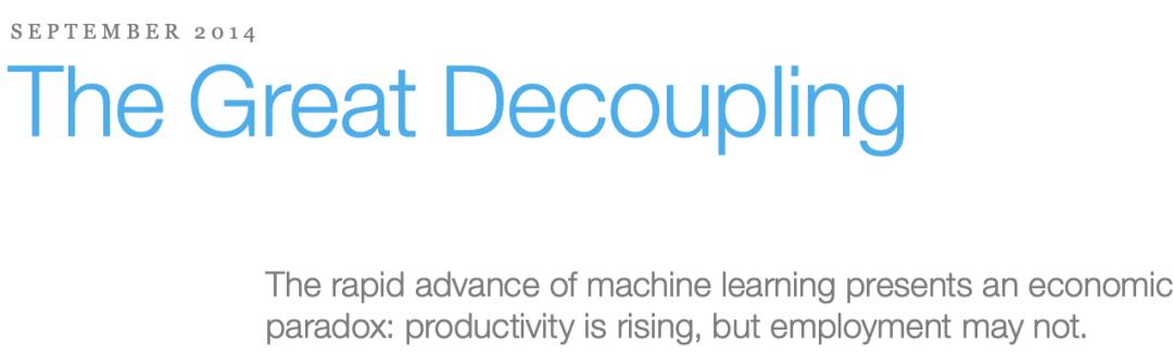 早在10年前,经济学家Erik Brynjolfsson就提醒过机器学习带来的悖论:生产率持续攀升,就业率却未必同步增长。