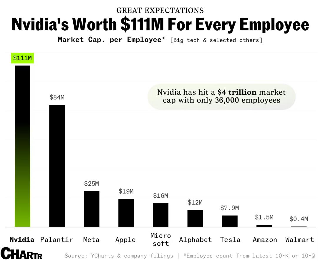 在市值突破4万亿美元之后,英伟达的「每位员工对应市值」也攀上了前所未有的高度。