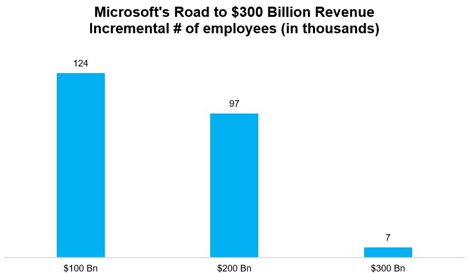 历史上,微软曾是人力密集型企业的典型——达到首个千亿和两千亿营收分别增聘12.4万和9.7万名员工。