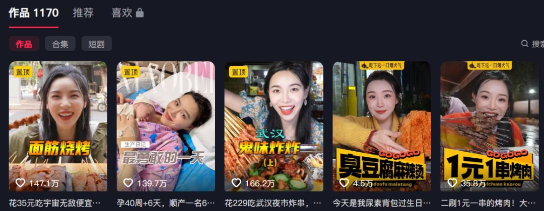 又比如在抖音平台以“吃播”为关键词搜索,粉丝量最高的“小贝饿了”,其粉丝高达1664万,获赞2亿。而浏览她的主页可以看到,除了日常的吃播视频,她的小号还包括了“带娃”“健身”“好物”“故事”“综艺”等不同的分类。
