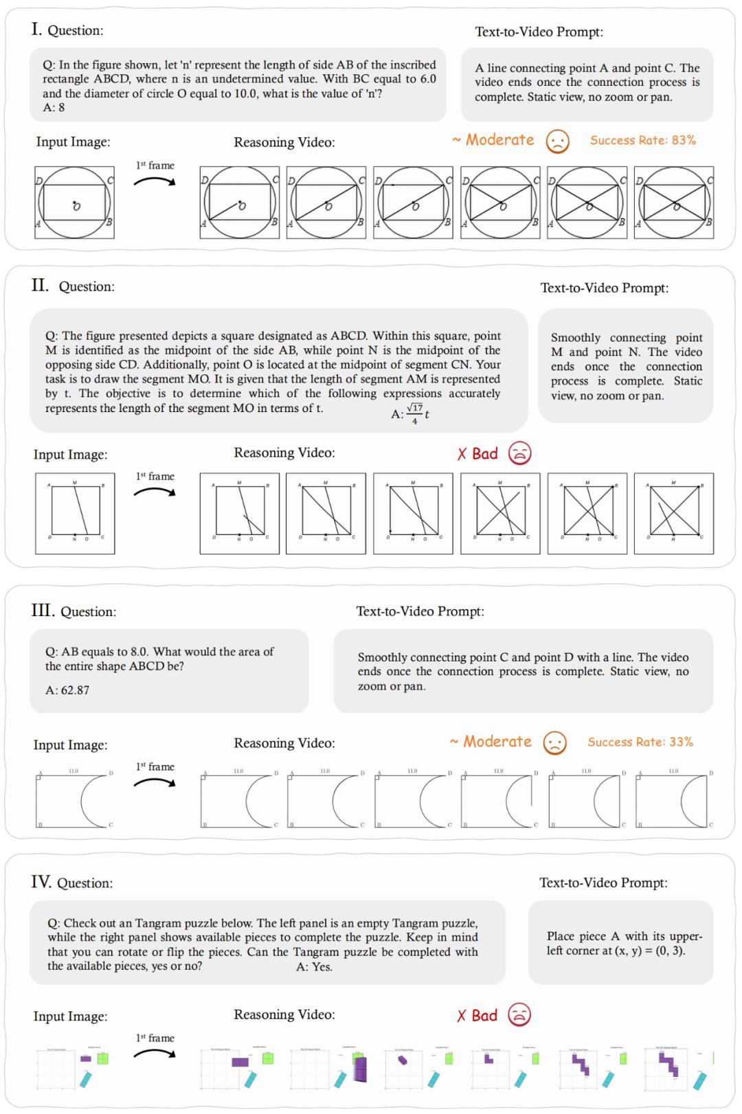 提示式设计创新:将抽象推理任务(如物理、几何、计数)转化为可视化视频生成挑战,迫使模型通过 “帧链推理” 展现过程性思考。