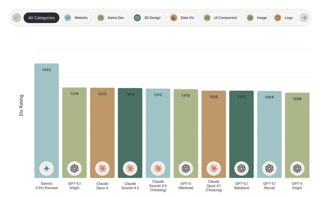 比如,在由开发者社区运营的实战编码竞技场Design Arena中,Gemini 3 Pro在整体排名中位列第一,并在五个代码赛区中的四个,网站、游戏开发、3D设计和UI组件中都占据榜首。这是自推出Design Arena以来最大的性能差异。