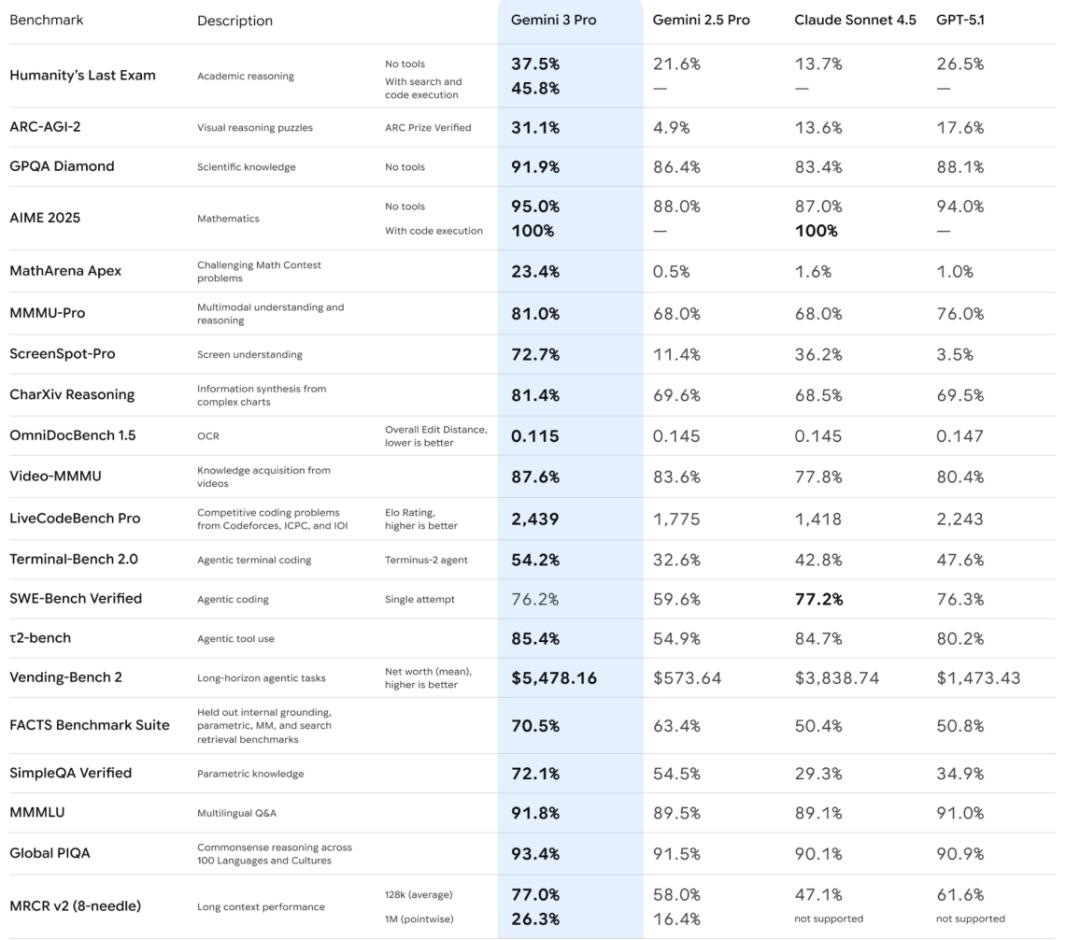 先看基础思考能力。Humanity's Last Exam (HLE)是衡量 AI 能否解决人类顶尖难题的终极试金石。在Gemini 3之前,Gemini 2.5 Pro的得分是21.6%,Claude Sonnet 4.5仅为13.7%。Gemini 3 Pro交出的答卷是37.5%(无工具)和45.8%(带工具)。