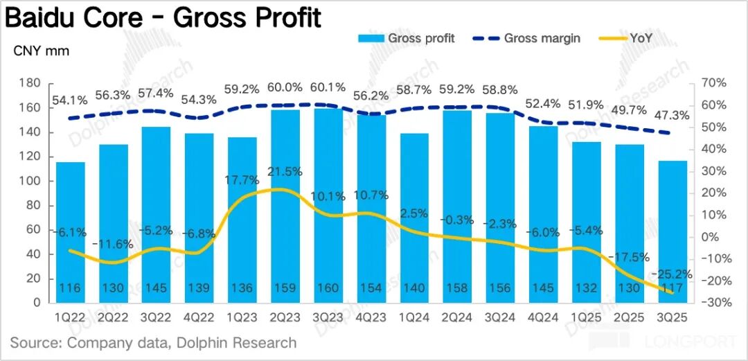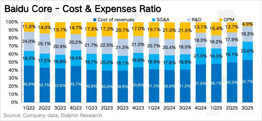 4. 核心利润率压力释放:百度核心的主业经营利润,也就是毛利润减掉三项经营费用,Q3 下降到了 12 亿,利润率仅 5%,远低于正常时期水平。这与多个因素相关: