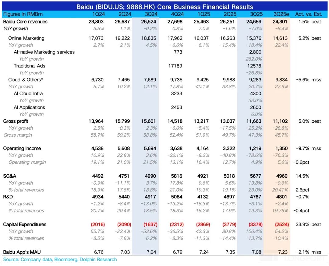 百度三季度业绩于 2025 年 11 月 18 日港股盘后放出,整体看符合预期,通过详细披露 AI 收入的动作,看的出来公司急切想撕掉传统标签、全面开讲 AI 新故事的决心。